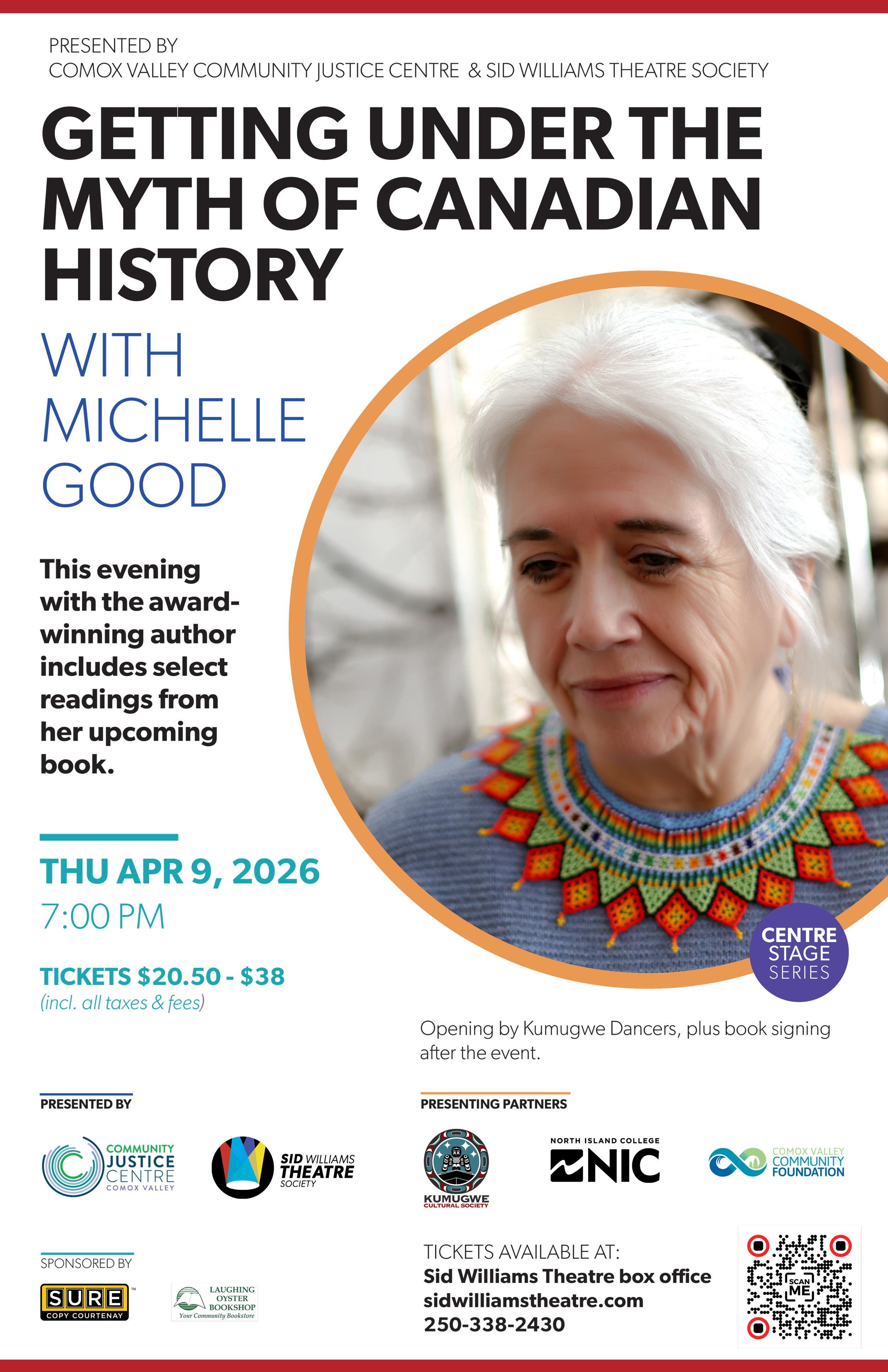 Purchase one of Michelle Good’s books at Laughing Oyster Bookshop by March 23, 2026 and mention the Community Justice Centre to receive a 15% discount on your book. Champion or join us for a conversation and enter to win a $150 gift certificate to the bookstore.